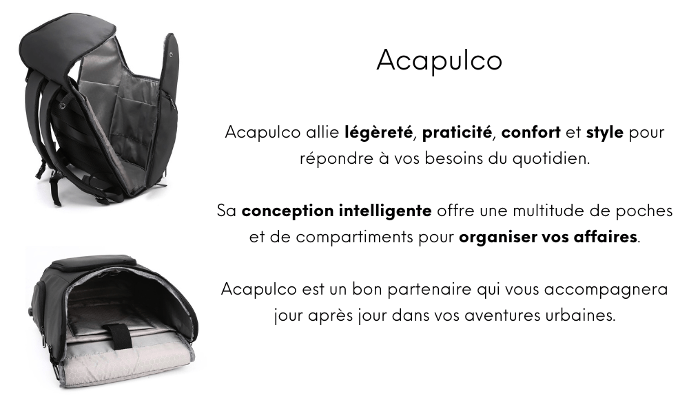 Stylé, solide et malin, le sac à dos Acapulco a été spécialement conçu pour être à la hauteur des exigences d’une personne active.