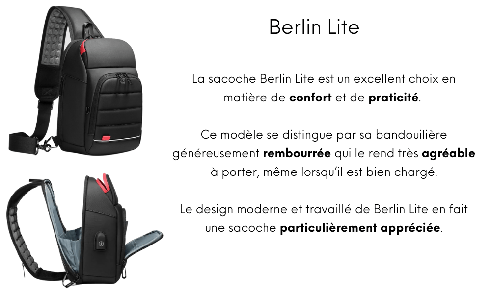 Stylée, solide et intelligente, la sacoche Berlin Lite a été spécialement conçue pour être à la hauteur des exigences d’une personne active.