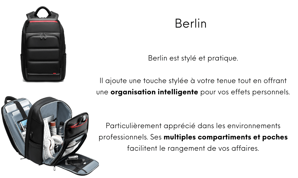 Stylé, solide et malin, le sac à dos Berlin a été spécialement conçu pour être à la hauteur des exigences d’une personne active.