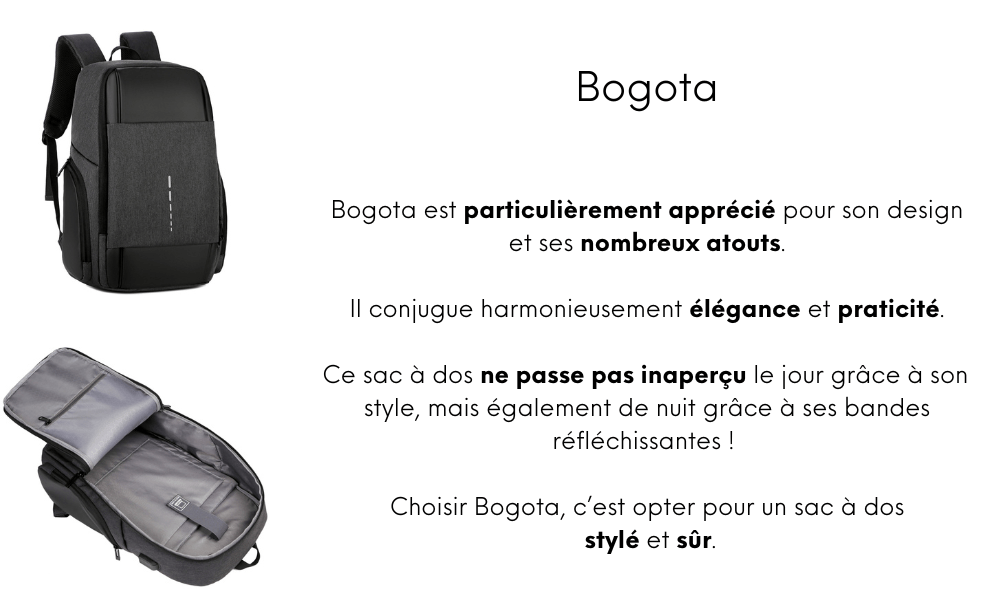 Stylé, solide et malin, le sac à dos Bogota a été spécialement conçu pour être à la hauteur des exigences d’une personne active.