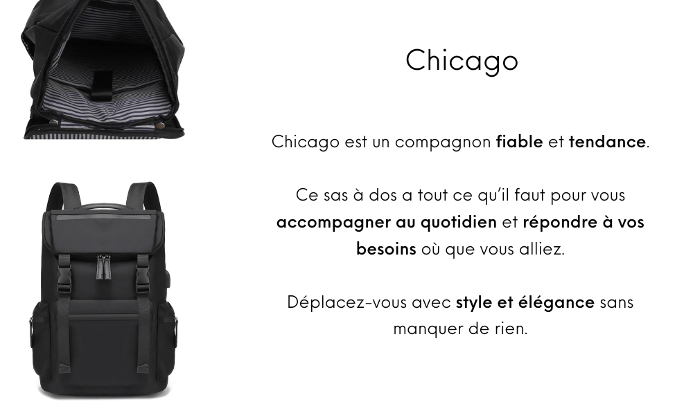 Ce système vous permettra d'ouvrir et fermer rapidement votre sac à dos Chicago juste en un clip.