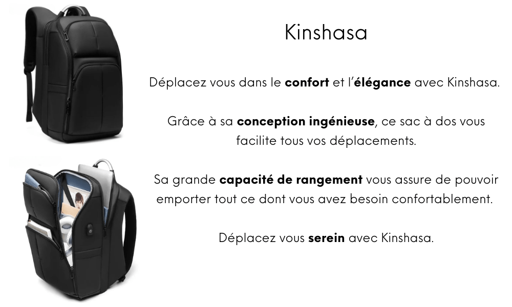 Stylé, solide et malin, le sac à dos Kinshasa a été spécialement conçu pour être à la hauteur des exigences d’une personne active.