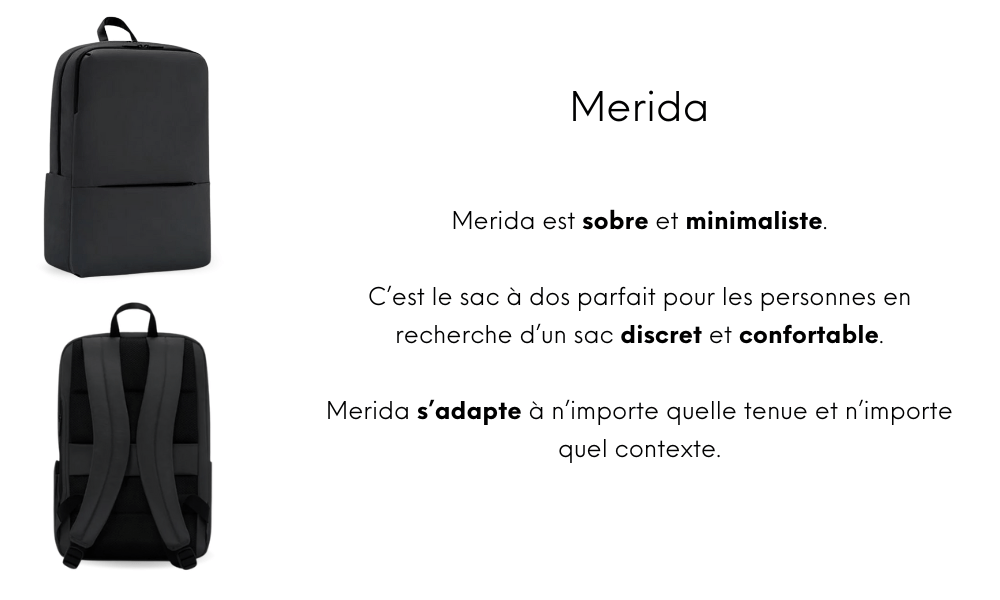 Stylé, solide et malin, le sac à dos Merida a été spécialement conçu pour être à la hauteur des exigences d’une personne active.