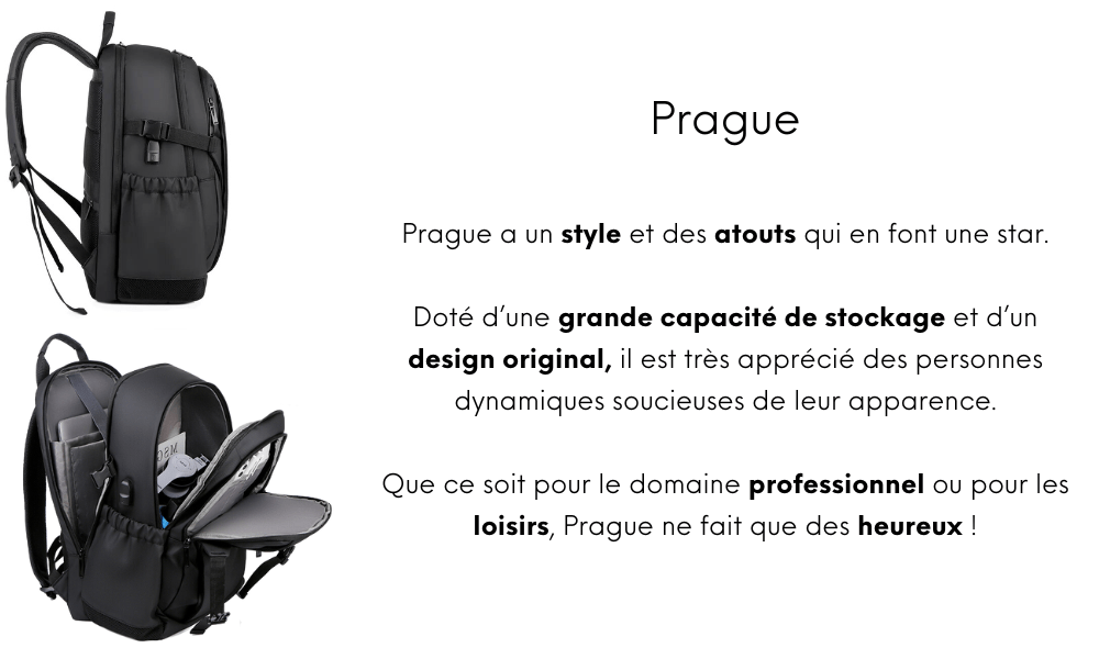 Stylé, solide et malin, le sac à dos Prague a été spécialement conçu pour être à la hauteur des exigences d’une personne active.