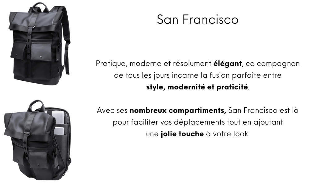 Stylé, solide et malin, le sac à dos San Francisco a été spécialement conçu pour être à la hauteur des exigences d’une personne active.