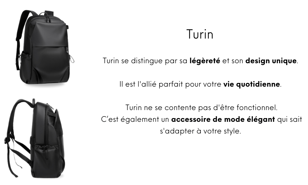 Stylé, solide et malin, le sac à dos Turin a été spécialement conçu pour être à la hauteur des exigences d’une personne active.