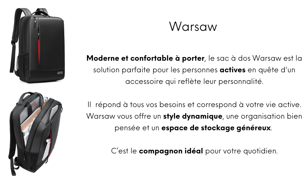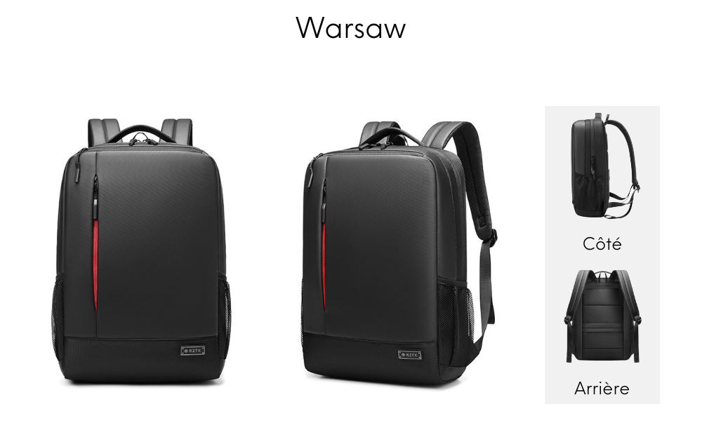 Stylé, solide et malin, le sac à dos Warsaw a été spécialement conçu pour être à la hauteur des exigences d’une personne active.