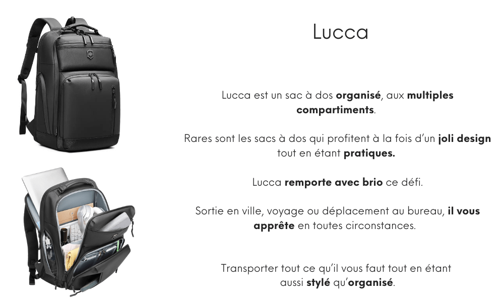 Stylé, solide et malin, le sac à dos Lucca a été spécialement conçu pour être à la hauteur des exigences d’une personne active.