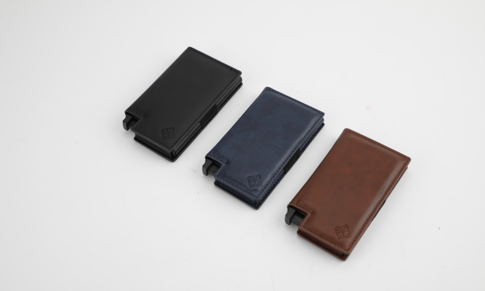 WALLACE, le portefeuille révolutionnaire à système d'éjection de cartes breveté, offre une solution intelligente pour organiser et accéder facilement à vos cartes bancaires.